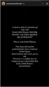 Në disa postime dhe story të publikuara në rrjetet sociale, Benita shprehet me tone të drejtpërdrejta, duke lënë të kuptohet se ka mbetur e pakënaqur me mënyrën si kanë rrjedhur ngjarjet drejt finales. Ajo pretendon se i kishte votat për të shkuar më tej, ndërsa pyet publikisht se “çfarë ndryshoi” në vendimin final.